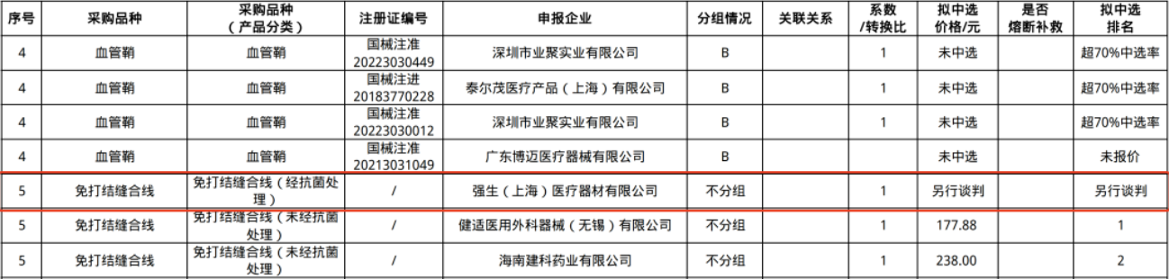 其中在免打結(jié)縫合線品種類別里,強(qiáng)生醫(yī)療的免打結(jié)縫合線(經(jīng)抗菌處理)一欄顯示“另行談判”。