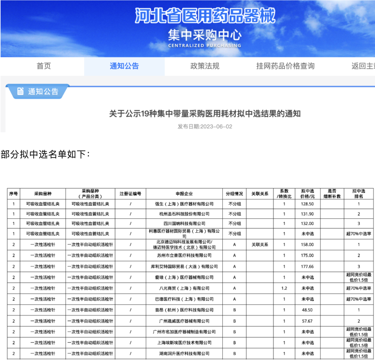 【概要描述】近日,河北省醫(yī)用藥品器械集中采購中心發(fā)布《關(guān)于公示19種集中帶量采購醫(yī)用耗材擬中選結(jié)果的通知》,公示《18種集中帶量采購醫(yī)用耗材擬中選結(jié)果》和《醫(yī)用干式膠片擬中選結(jié)果》。